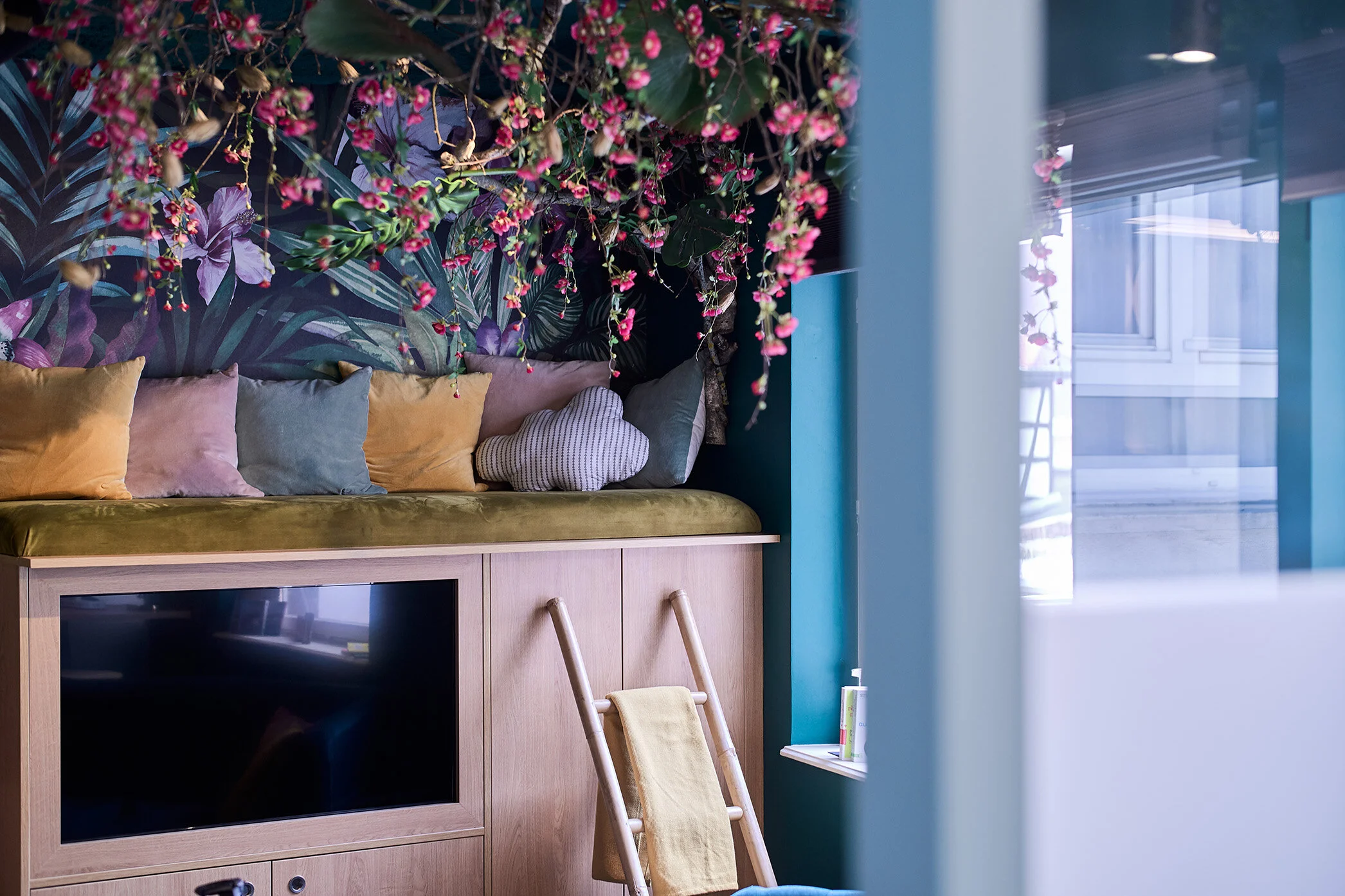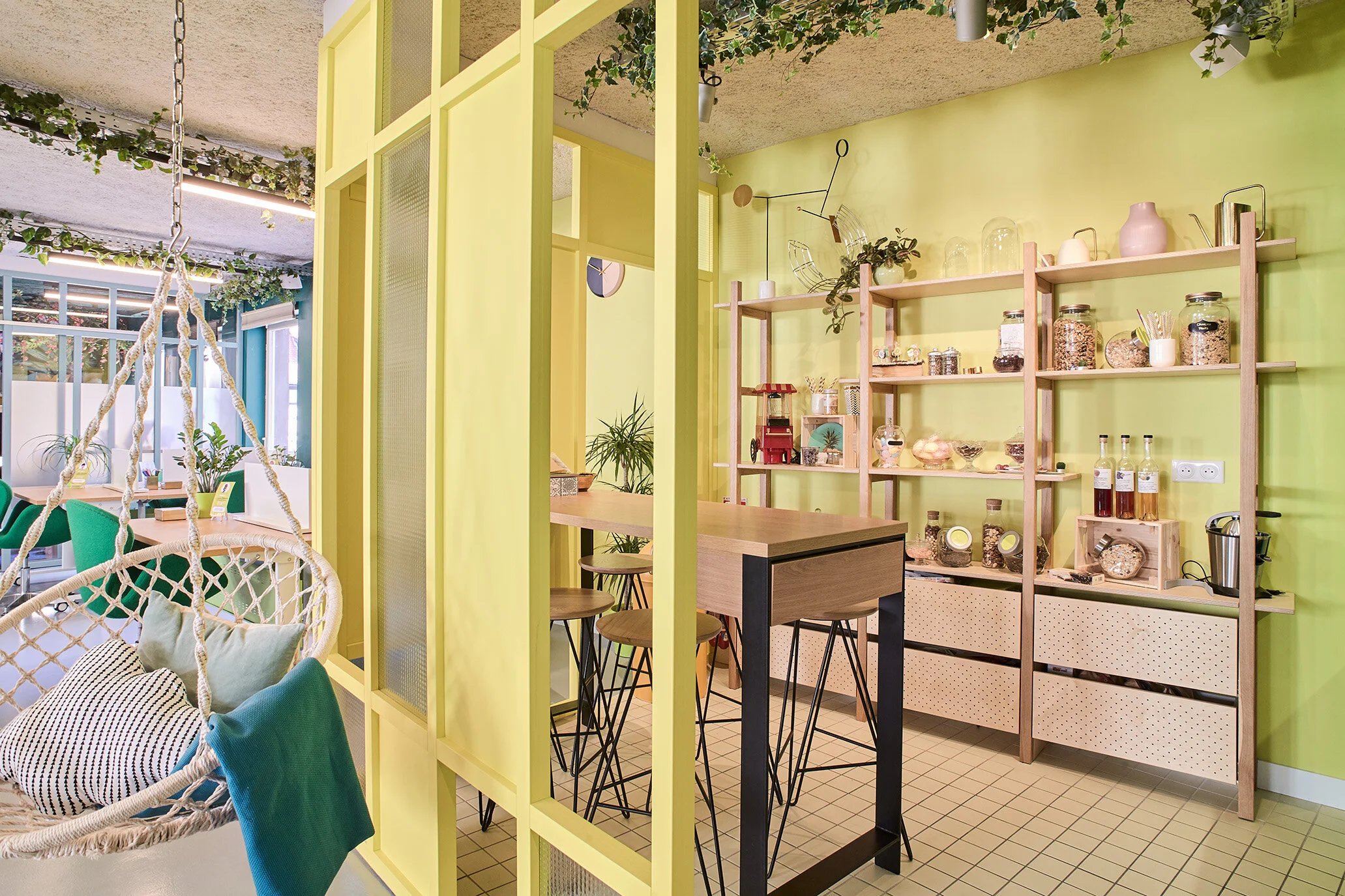 Décalé et dynamique, les couleurs et les textures s’entremêlent à l’image du concept. Entre brunch, meeting et relaxation, chaque pièce développe son univers graphique avec sa gamme de couleurs et ses matériaux en fonction de ses usages.